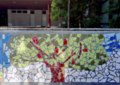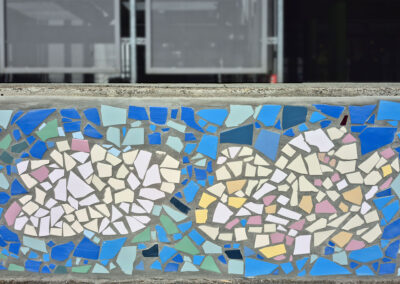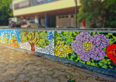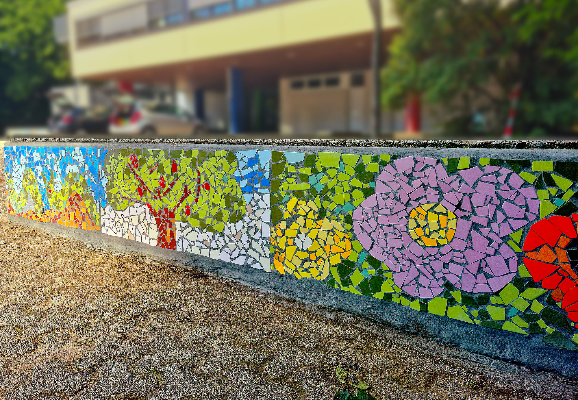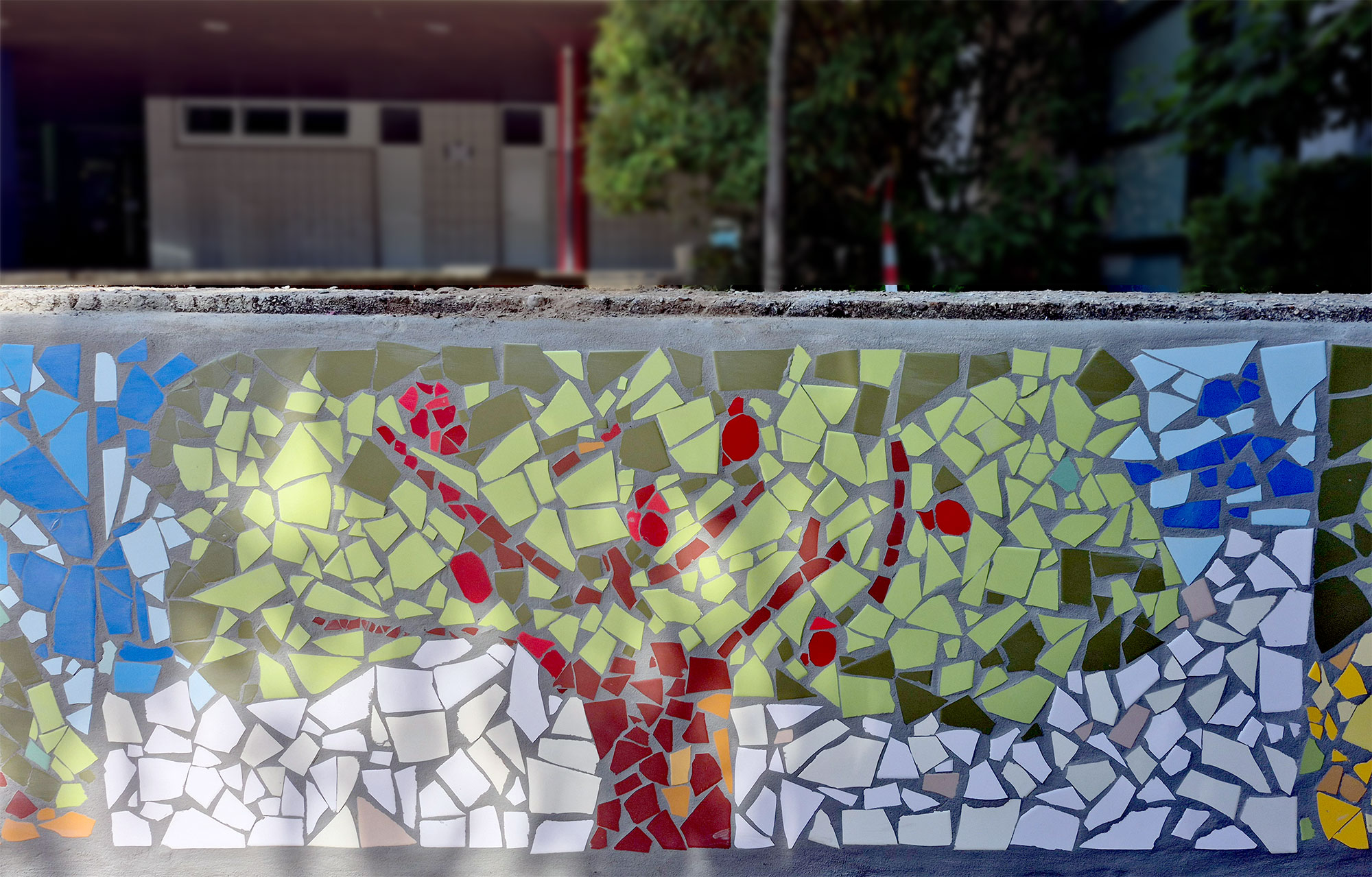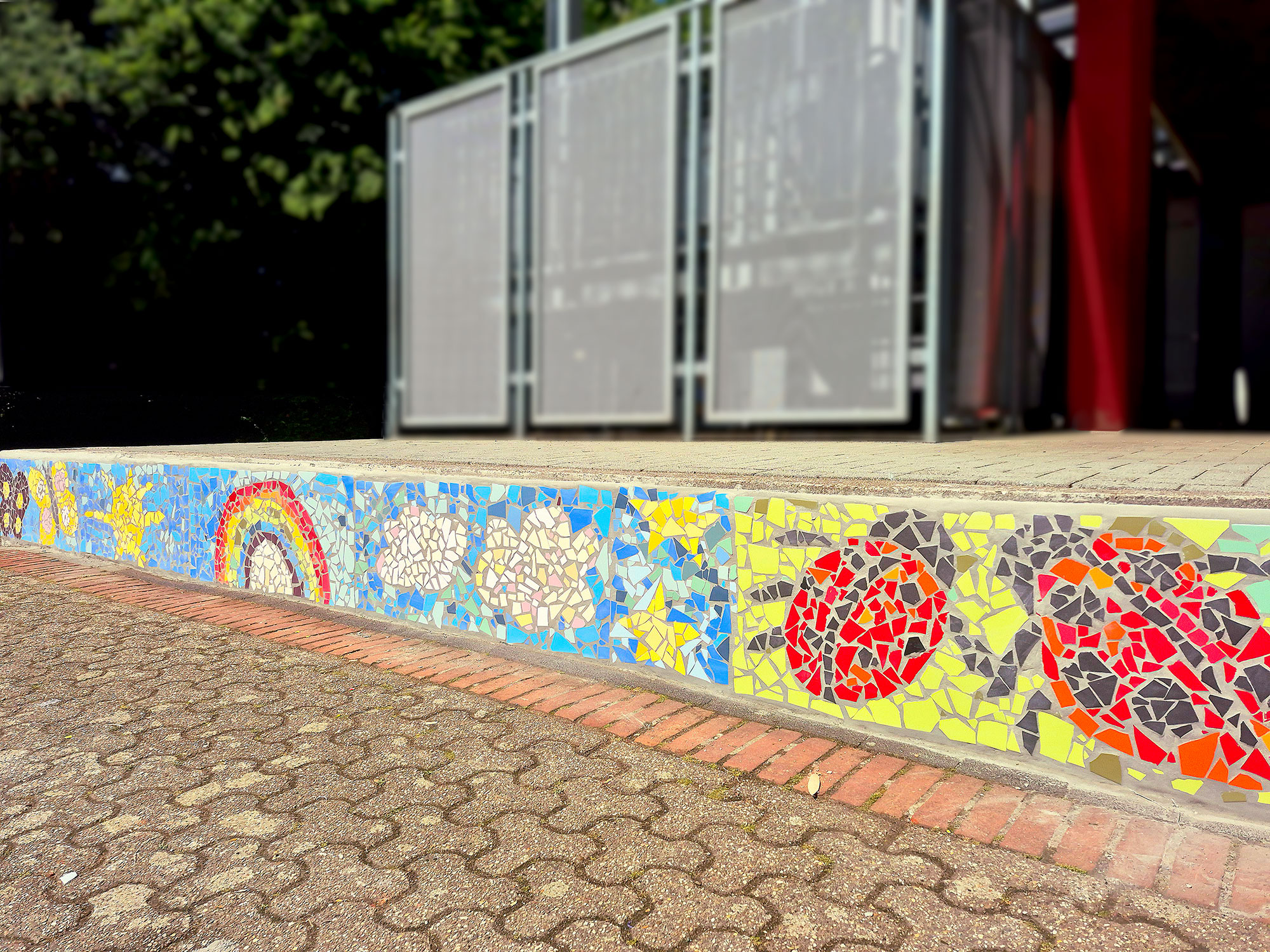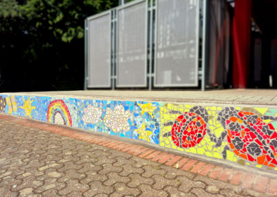 Einmal wöchentlich erarbeiteten die Schülerinnen und Schüler ein ca 10 Meter langes Mosaikband aus Schmetterlingen, Sonne, Regenbogen, Sternen, Wolken, Blumen und Bäumen, dass die vertikale Fläche, die die Schulhofebenen verbindet, gestaltet.